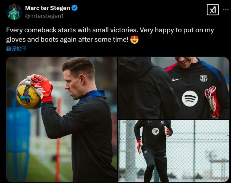 特爾施特根寫道:“每次回歸都是從小的勝利開始的,很高興我能在時(shí)隔一段時(shí)間后再次穿上門將手套和球鞋!”