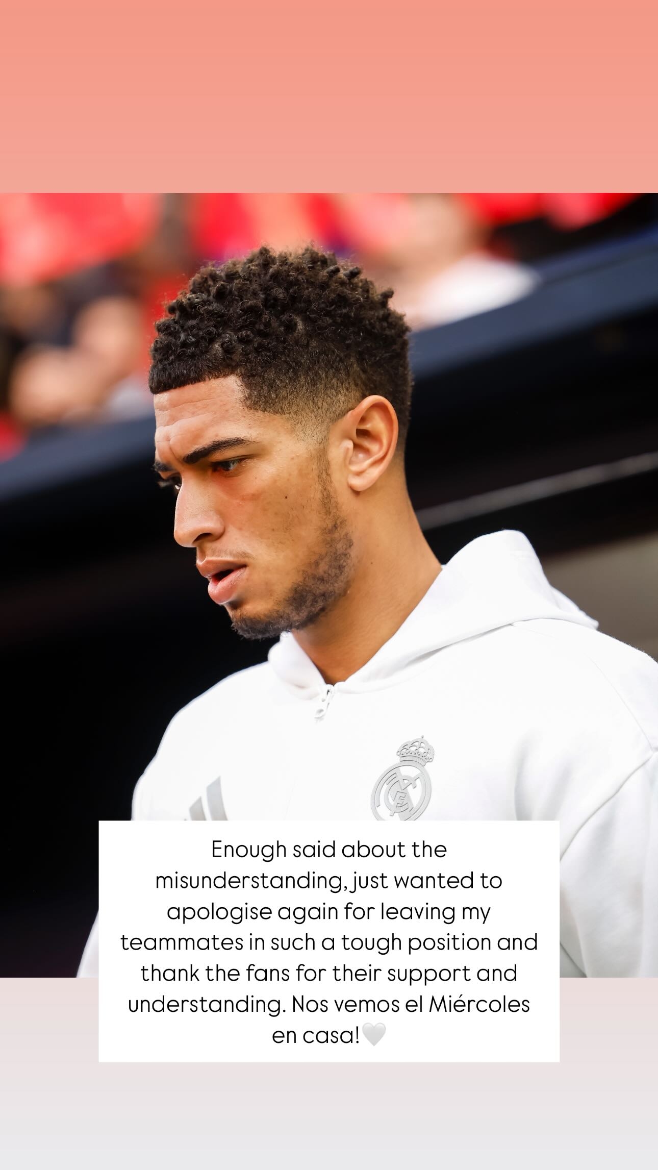 貝林厄姆:“關(guān)于這場誤會(huì),已經(jīng)說得夠多了,現(xiàn)在我只想再次為讓隊(duì)友們陷入如此艱難的境地而道歉, 也感謝球迷們的支持與理解。周三主場見(歐冠對(duì)陣曼城)!”
