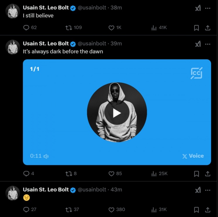 博爾特發(fā)了一個心情沮喪的表情包,然后寫道:黎明前總是黑暗的,我仍然有信心。