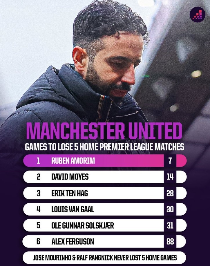 OPTA也盤點了曼聯(lián)主帥執(zhí)教球隊輸掉前5個英超主場用時,阿莫林最快,穆里尼奧、朗尼克執(zhí)教下從未輸掉5個主場,具體如下:
